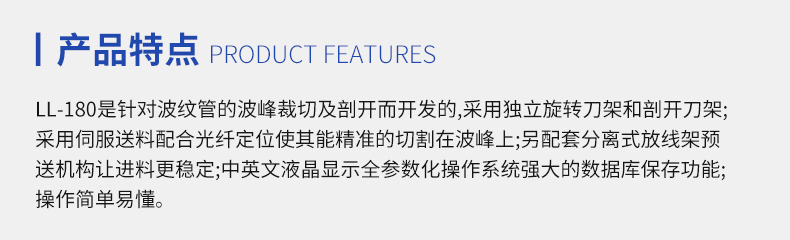 LL-180是針對波紋管的波峰裁切及剖開而開發(fā)的,采用獨立旋刀架和剖開刀架;采用伺服送料配合光纖定位使其能精準的切割在波峰上;另配套分離式放線架,預送機構讓進料更穩(wěn)定;中英文液晶顯示,全參數(shù)化操作系統(tǒng),強大的數(shù)據(jù)庫保存功能;操作簡單易懂。