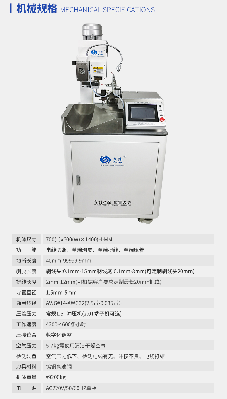 LL-551/551+T(帶扭線)全數(shù)字智能單端壓著機   產品說明:   1.精巧,緊湊的設計,極佳人性化設計,占地面積小。   2.數(shù)字智能觸摸屏和按鍵中文操作菜單易學易用。   3.可儲存100套加工程序,更換工序和材料...